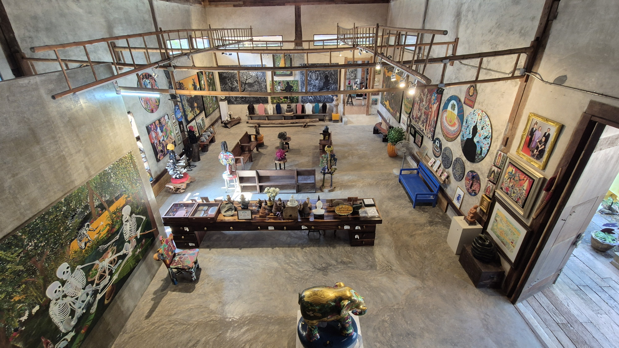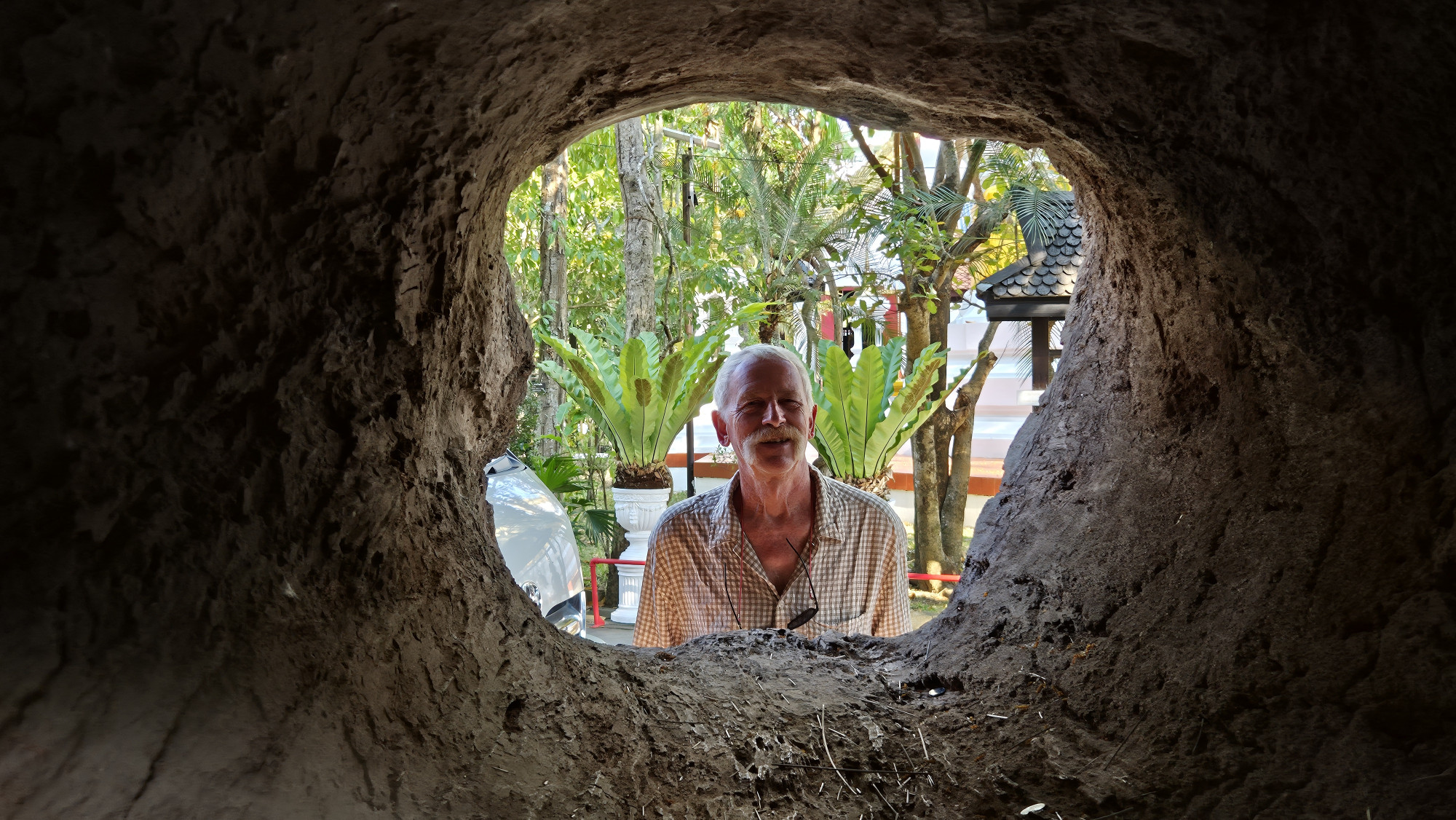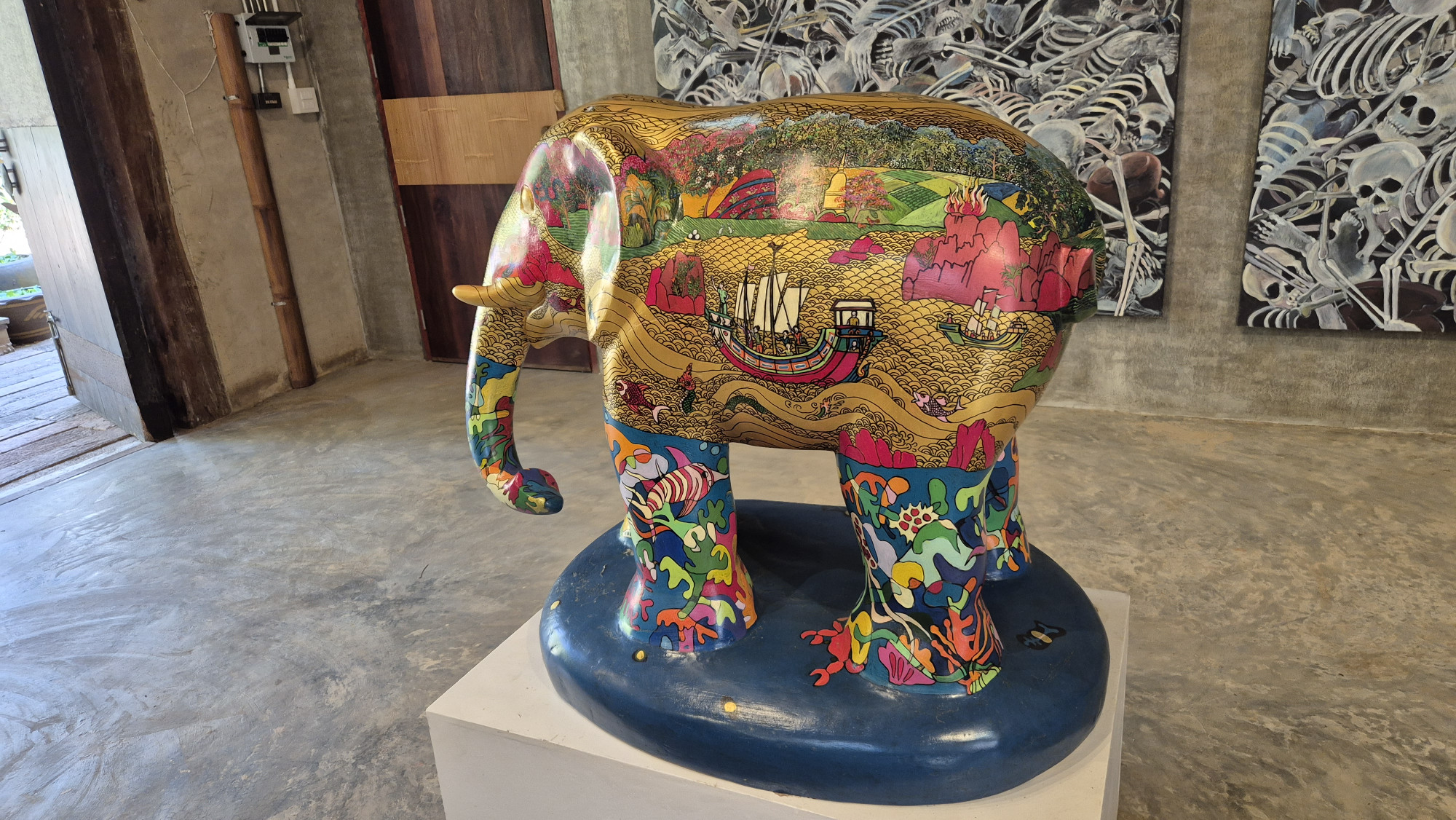 Witer fuhren wir mit dem Motorrad den „Berg“ hoch zur Doi Sa Ngo Village. Abgesehen von leeren Eco-Lodges mit wunderbarem Ausblick übers ganze Land war sonst nichts zu sehen. Hingegen unten im Tal, in der Sridonmoon Art Space Ausstellung, war es dafür doppelt eindrücklich. Zufällig war der betagte Bruder der im letzten Jahr verstorbenen Künstlerin Sriwan Janehuttakarnkit anwesend und hieß uns wärmstens willkommen. In einem riesigen, doppelstöckigen Gebäude und Atelier waren unzählige Werke von Sriwan in jeder Art und Weise zu bestaunen und dies inmitten einem intakten Stück Urwald. Abschließend noch einmal ein sehr feines Abendessen am Mekong, Streetfood bringts!
