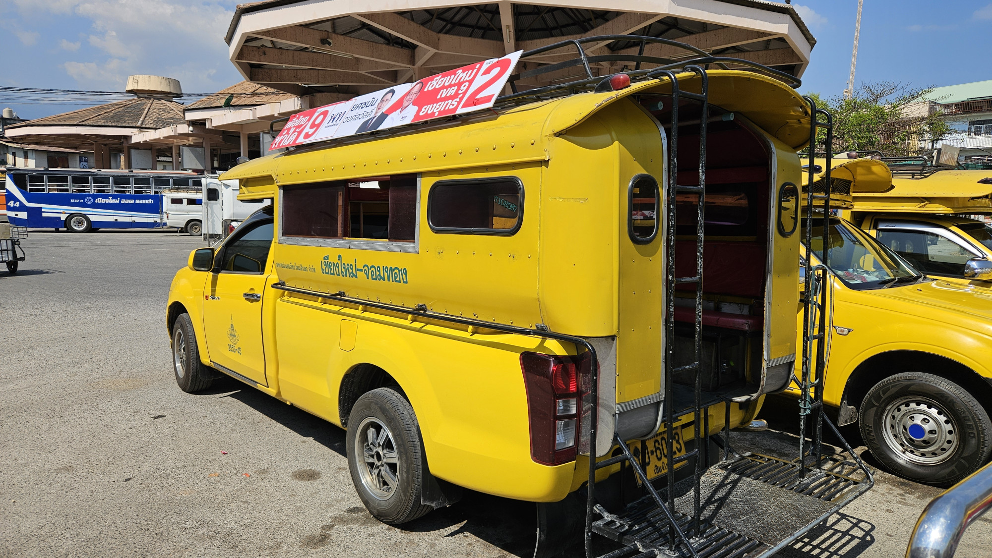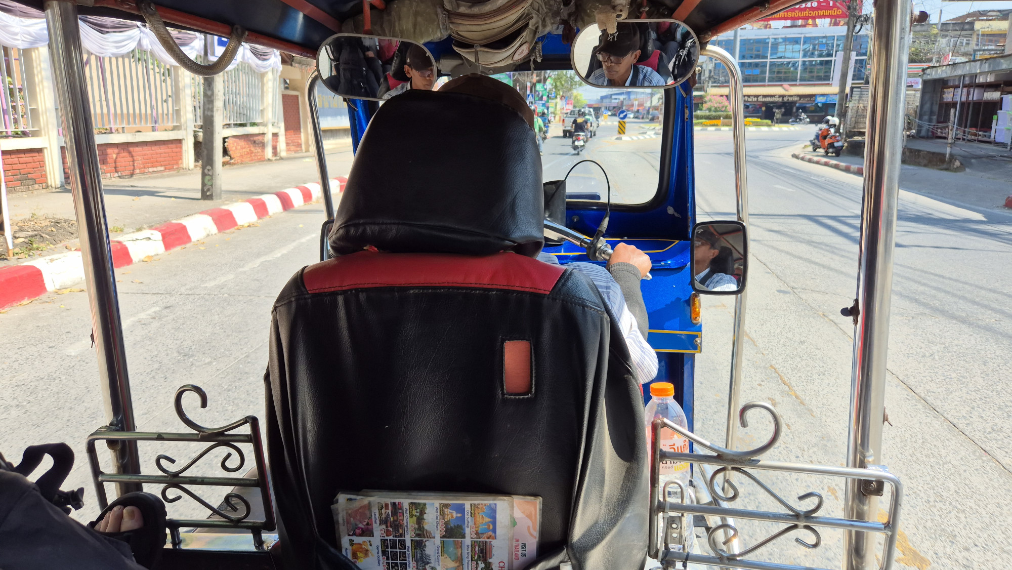 Am 4.2. fuhren wir mit Bus und Tuk Tuk weiter nach Mae Chan.  Bei einem Strassen-Polizeiposten übernahm der diensthabende Polizist, gutgemeint, die Verantwortung für unsere Weiterfahrt und stoppte  den nächsten Minibus. Geplant war eigentlich eines der regelmäßig in den nördlichsten Teil von Laos fahrenden gelben Tuk Tuk zu nehmen um nach Tha Ton zu gelangen. Wir nahmen das Angebot an, da einen Polizisten belehren heikel sein könnte.