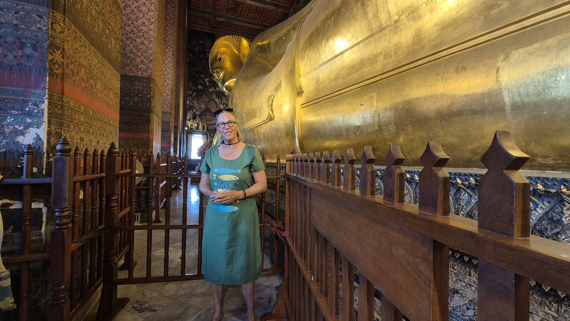 Am ersten Tag pendelten wir mit der Metro in die Stadt. Dort kauften wir ein Tages Abo auf dem Hop on and off Boat, aßen in der Nähe der Fähre Streetfood.  Leider hatten wir für 4 Nächte gebucht, 3 hätten für uns längstens gereicht. Chinatown und der liegende Buddha  war für Iris ein Muss. Auch wurde sie dort von den ausgebildeten Tempel Thaimasseuren 1 Stunde massiert.