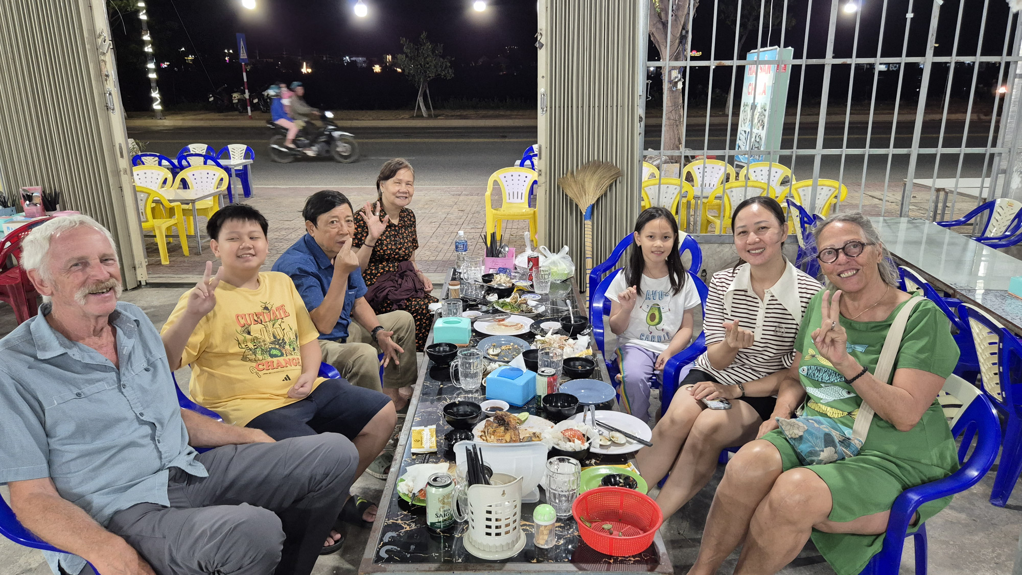 Am 19.12.25 ging die Reise per Zug weiter nach Thap Cham. Vor jedem Wagon stand ein uniformierter Schaffner in weissem Hemd und Krawatte, der uns an unsere vorreservierten Plätze führte. Falls gewünscht, wurde frisch zubereitetes Essen serviert. Nach einer 6h Fahrt, stiegen wir gleichzeitig mit Bisa und ihren 2 wunderbaren Kindern aus. Es war eine herzliche Begegnung. Im Hotel Duc Chinh in Khann Hai hatten wir im 4. Stock ein wunderschönes Zimmer mit Blick aufs Meer sowie einer riesigen Dachterrasse gebucht. Wir waren weit und breit die einzigen Touristen. Wir hatten Glück, dass um die Ecke das einzige offene Restaurant lag. Ein sehr beliebtes Fisch- und Meeresfrüchte Restaurant, das wir gemütlich zu Fuss erreichen konnten. Zufällig feierten dort Bisa mit ihrer Familie den Geburtstag vom 13j. Bin. Spontan wurden wir eingeladen mit zu essen. Die Vietnamesen sind ein sehr herzliches wie auch gastfreundliches Volk.