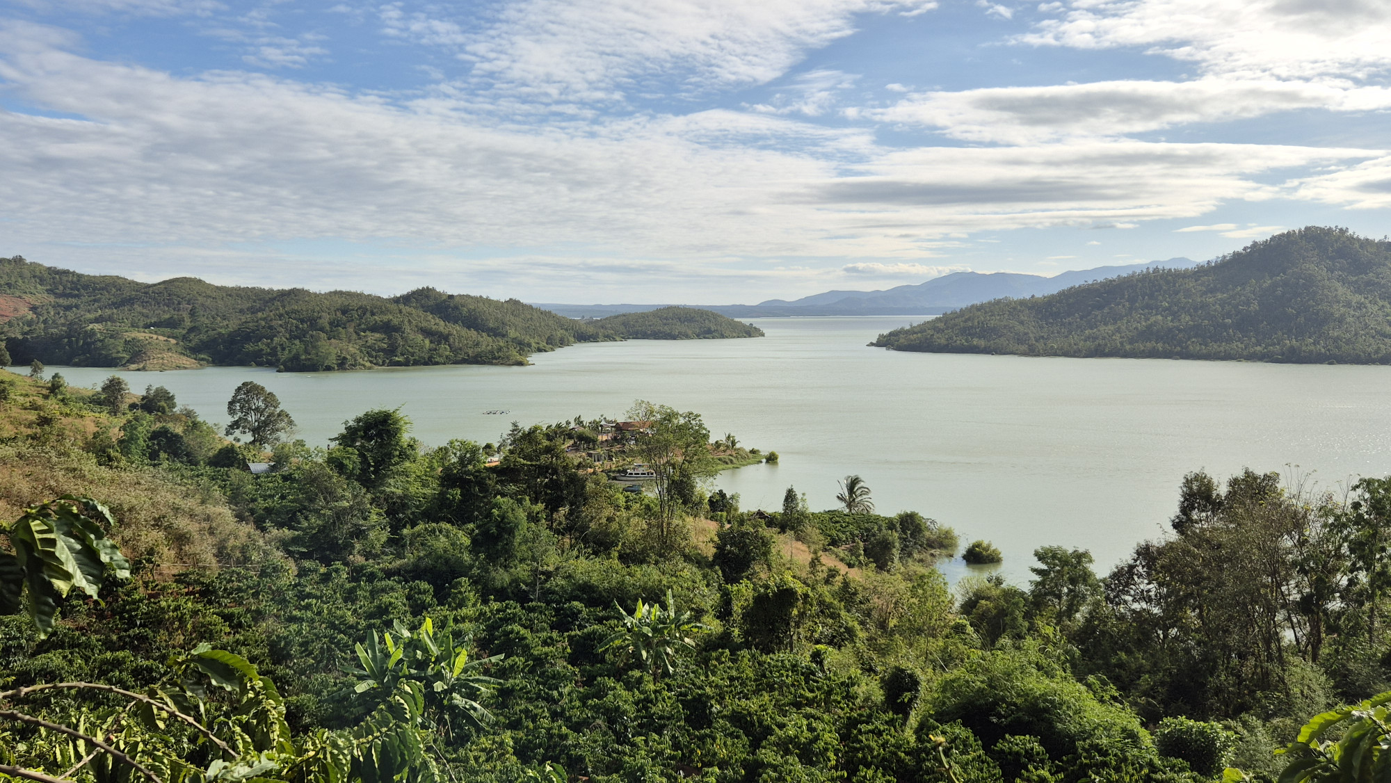 Im nahe gelegenen Dorf Namens Kon k`tu besuchten wir die Bahnar, ein altes indigenes Volk, das ein Teil eines Bergvolkes der Montagnards ist. Die Sprache gehört zu einer Untergruppe der Malayo Polynesischen Sprachgruppe. Die traditionellen Stoffe sind Schwarz rot. Als wir das Gemeinschaftshaus besuchten, wurden wir von den getrennt essenden Frauen sehr freundlich begrüsst. Wie vieler Orts, mischten sich auch hier heidnische wie christliche Bräuche. Vor dem auf Säulen gebauten Gemeinschaftshaus, das nur über einen eingekerbten Baumstamm erreichbar ist, war eine kitschige Krippe aus aufgefüllten Plastiksäcken aufgebaut. Weiter ging die Fahrt über Kautschuk- und Kaffeeplantagen, durch das Dorf Plei Weh Richtung Stausee. Wir sahen Wasserbüffel, Kuhhirte mit Herden und überall fröhlich lachende winkende Kinder, die Hello riefen. Kaum hielten wir an, wurden wir von einer Schar neugieriger Kinder umringt.